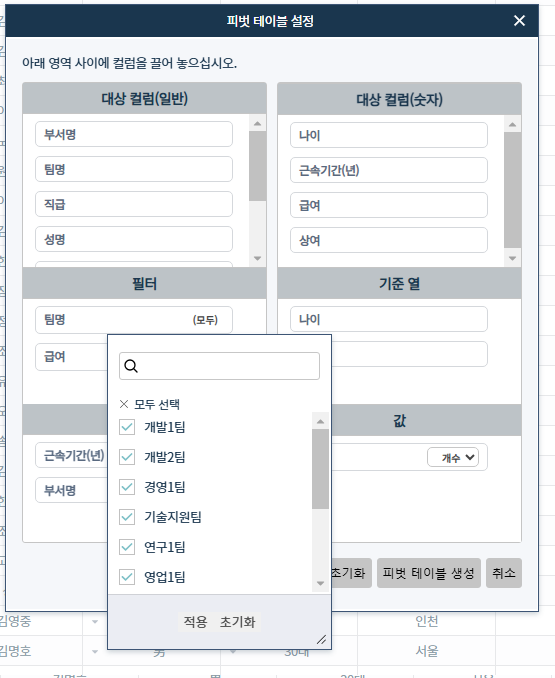추가된 피벗 필터 기능에 맞춰 피벗 다이얼로그 UI에 변경이 있습니다.