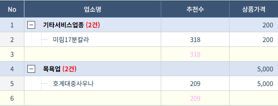 options.Cfg = { UseGroupSubTotal:2 // 그룹행에 소계를 함께 표시 }; optons.Col =[ ... {"Header": "추천수","Name": "sRcmn","Type": "Int","Format": "#,###","MinWidth": 140,"Width": 140 ,GroupSubTotal: { Type: "Sum", Format: "#,###", TextColor: "#FFB2F5" } }, ... ]; |